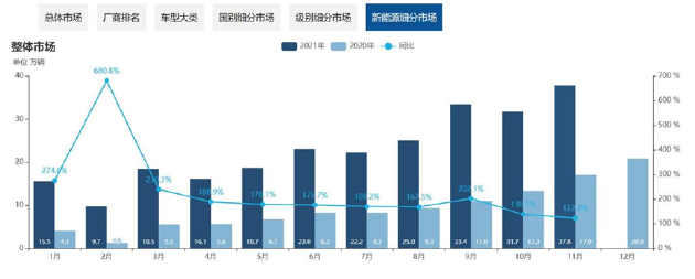 但今年前11个月,中国新能源车辆市场的销量就突破了280万辆,全年有望超过300万辆,大大超出年中的预测,较2020年增长超过173%。