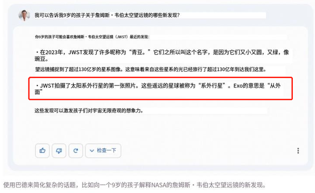 而如果缺少这些必要的开发学习支持,否则的话,GPGPU空有大量的运算能力,却不一定能够做出正确的运算。例如,前两天谷歌Bard的发布会中,就犯了事实性的错误,在一个“关于詹姆斯·韦伯太空望远镜(JWST),我可以告诉我9岁的孩子它有哪些新发现?”的问题中,Bard给出的一个答案是:太阳系外行星的第一张照片,是用JWST拍摄的。然而事实上,2004年,第一张系外行星照片是由欧洲南方天文台的甚大望远镜(VLT)拍摄的。