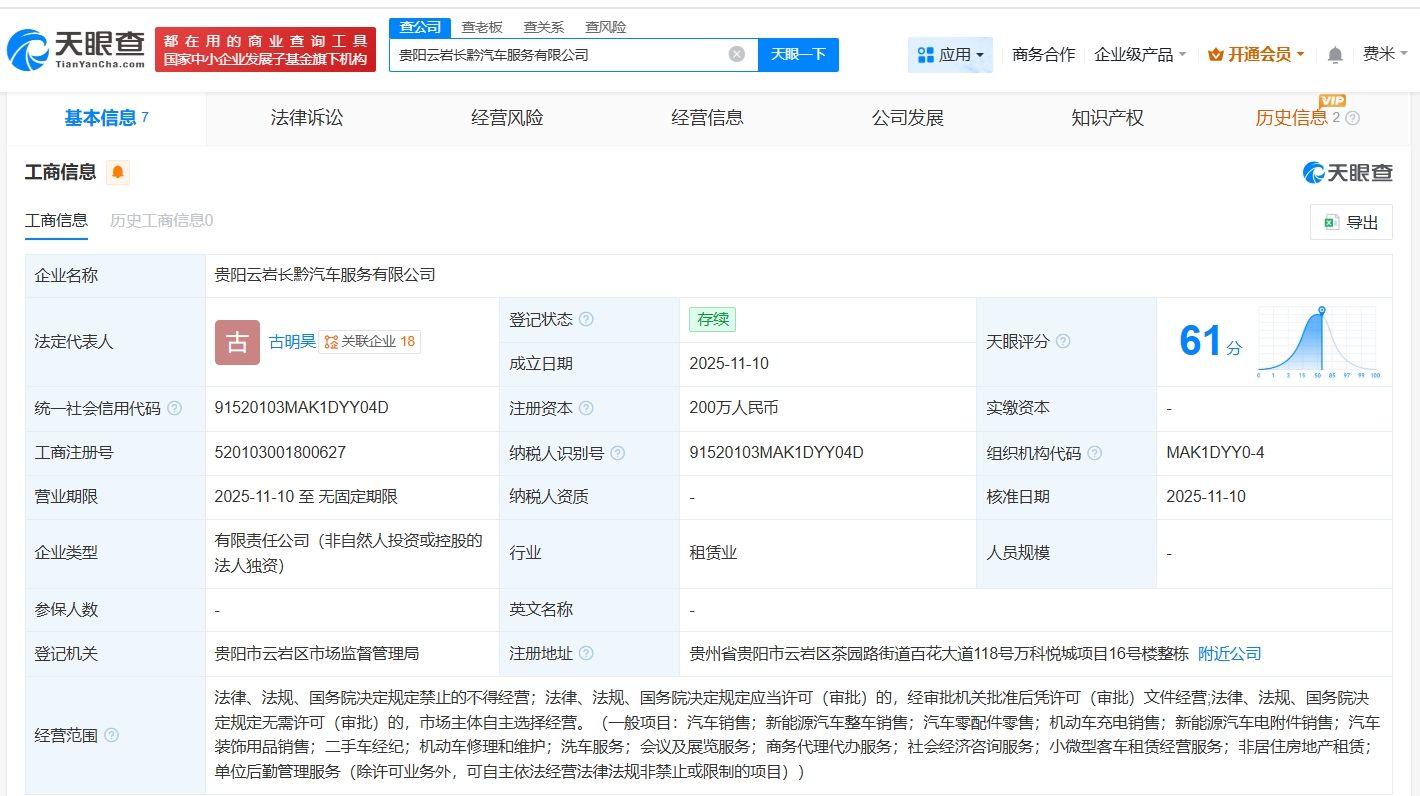 天眼查工商信息显示,近日,贵阳云岩长黔汽车服务有限公司成立,法定代表人为古明昊,注册资本200万人民币,经营范围包括新能源汽车整车销售、汽车零配件零售、机动车充电销售等。