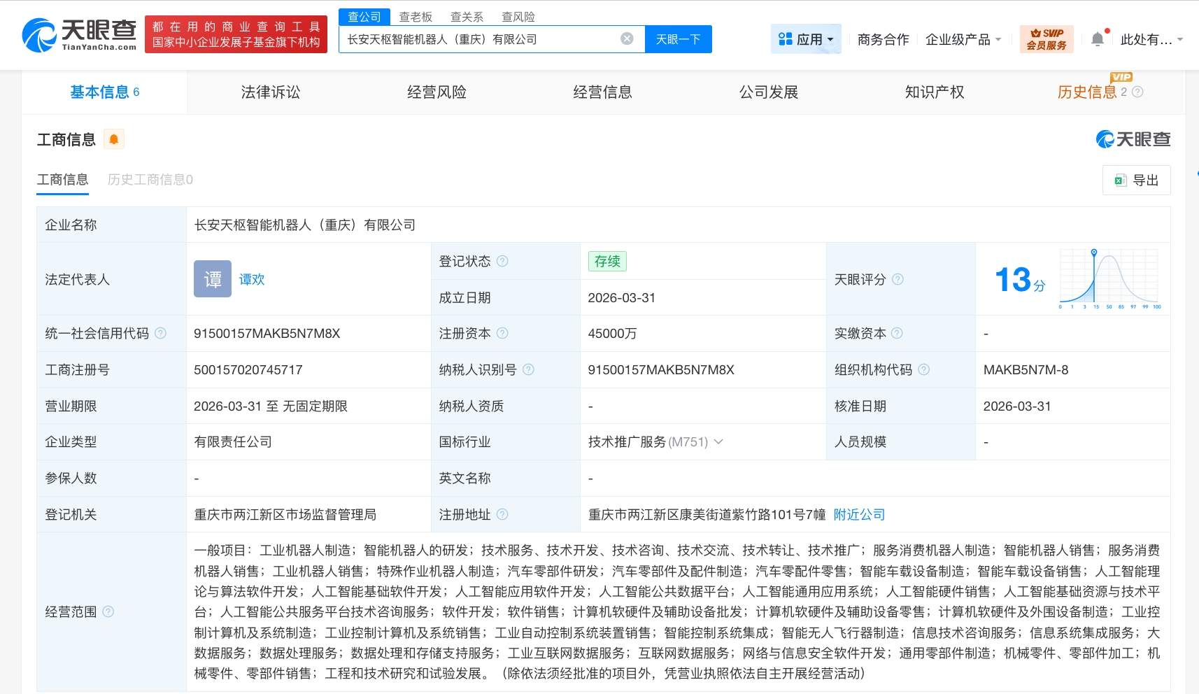 长安天枢智能机器人公司完成工商登记 注册资本4.5亿观点