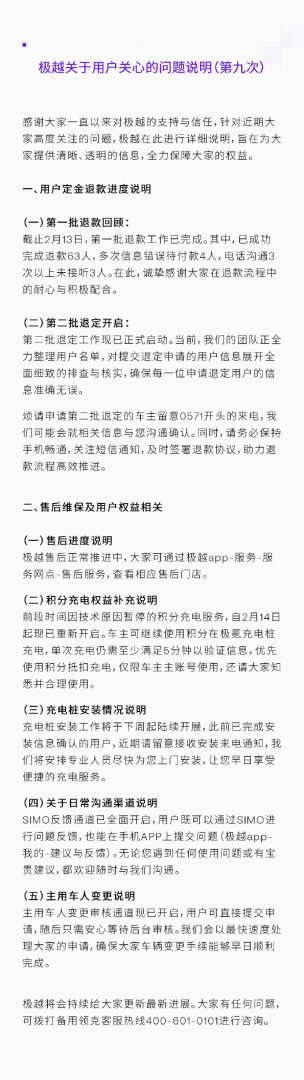 【TechWeb】2月14日消息,据极越官方微博消息,极越发布关于用户关心的问题说明(第九次),针对近期用户高度关注的问题进行了详细说明。