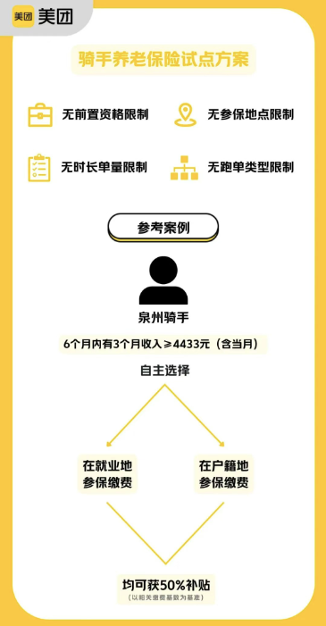 美团启动骑手养老保险试点,只要骑手在过去6个月内有3个月收入达到当地社保缴费基数下限,将正式在全国范围内上线养老保险补贴。