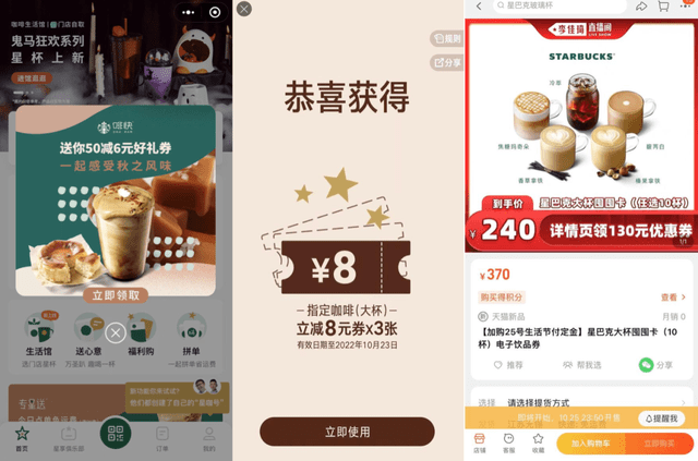 频推新品的同时,“高冷”的星巴克也在放下身段。去年底,「真探」关注到,在星巴克的APP和小程序上,“送你50减6元好礼券,一起感受秋之风味”、“两片指定蛋糕8折”随意可领;在李佳琦直播间,双11预售“星巴克大杯囤囤卡”,任选10杯咖啡,到手价240元。