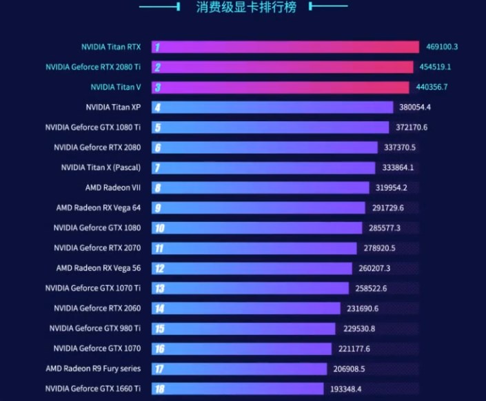 在消费级显卡排行榜中,英伟达Titan RTX 居于榜首,其次是RTX 2080Ti和Titan V。