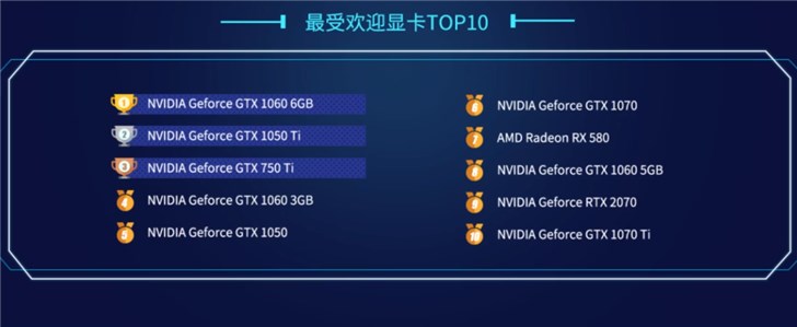 在最受欢迎显卡排行榜中,英伟达产品占据绝大多数,其中GTX 1060 6GB、GTX 1050Ti、GTX 750Ti位居前三,AMD只有一款RX 580上榜。