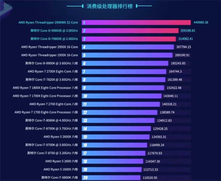 在CPU性能排行榜中,AMD 2990WX稳居榜首,第二名为英特尔i9-9980XE,第三名为英特尔7980XE。
