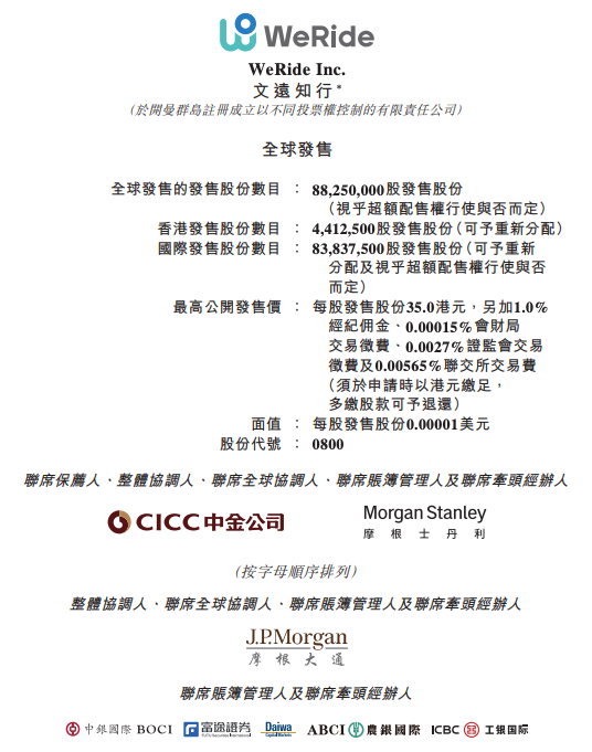 文远知行宣布在香港联合交易所进行全球发售,计划发行共计88,250,000股A类普通股,其中香港公开发售占4,412,500股(5%),国际发售占83,837,500股(95%)。每股最高发售价为35.0港元,股票代码为0800。
