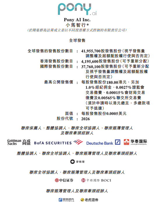 小马智行宣布在香港联合交易所进行全球发售。该公司计划发行共计约41,955,700股A类普通股,其中香港公开发售占4,195,600股(10%),国际发售占37,760,100股(90%)。每股最高发售价定为180.00港元,股票代码为2026。