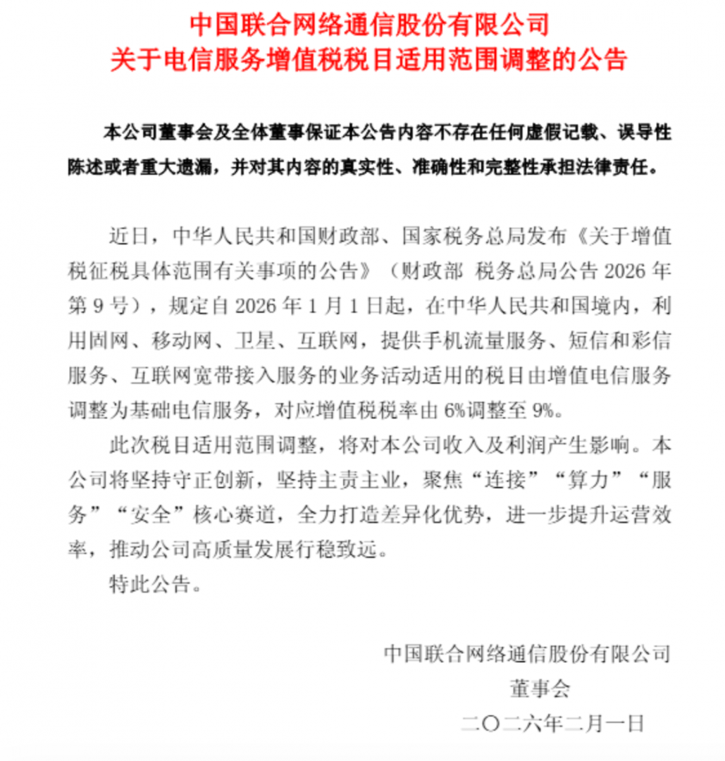 近日,中华人民共和国财政部、国家税务总局发布《关于增值税征税具体范围有关事项的公告》。规定自2026年1月1日起,在中华人民共和国境内,利用固网、移动网、卫星、互联网,提供手机流量服务、短信和彩信服务、互联网宽带接入服务的业务活动适用的税目由增值电信服务调整为基础电信服务,对应增值税税率由6%调整至9%。