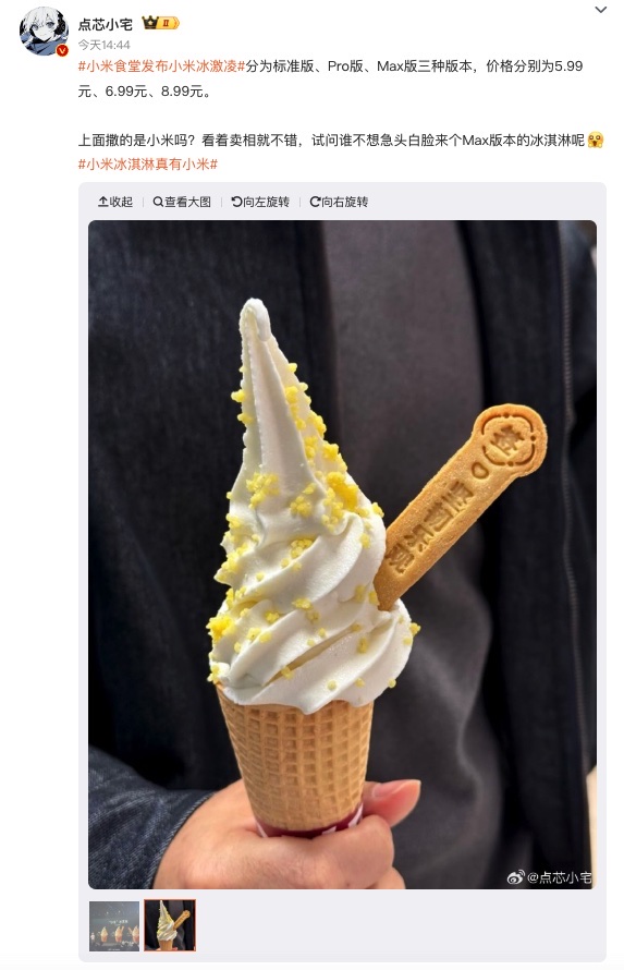 5.99元起 小米食堂发布“小米冰激凌”:分为标准版/Pro版/Max版快讯
