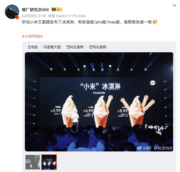 【TechWeb】4月10日消息,小米在年度价值观大会期间,其内部食堂正式推出一款名为“小米”的现制冰激凌。