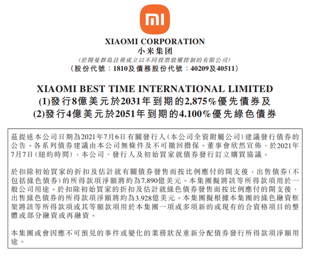 7月8日早间消息,小米集团发布公告称小米公司全资附属公司发行8亿美元于2031年到期的2.875%优先债券,发行4亿美元于2051年到期的4.100%优先绿色债券。