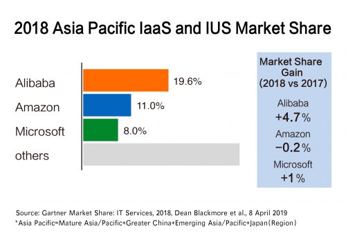 这些投入正在形成不断扩大的市场优势。据Gartner最新市场调研结果,过去一年,阿里云在亚太市场份额得到大幅提升。2018年阿里云在亚太市场排名第一,市场份额达到19.6%,比2017年的14.9%,增加了4.7个百分点。市场份额首次超越亚马逊和微软的总和。
