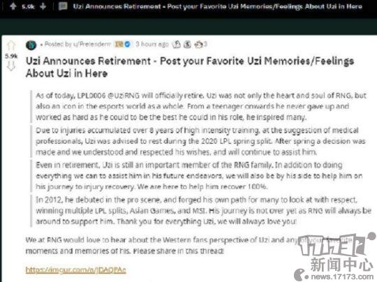 据悉,国外论坛Reddit上的网友,不仅截图了Uzi的微博内容,对其因身体健康宣布退役一事发表大量讨论,管理还将LOL版本的名字暂时改成了“League of Uzi”,这是该论坛板块的首次。