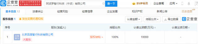 企查查股权穿透显示,该公司由北京百度智行科技有限公司100%控股。