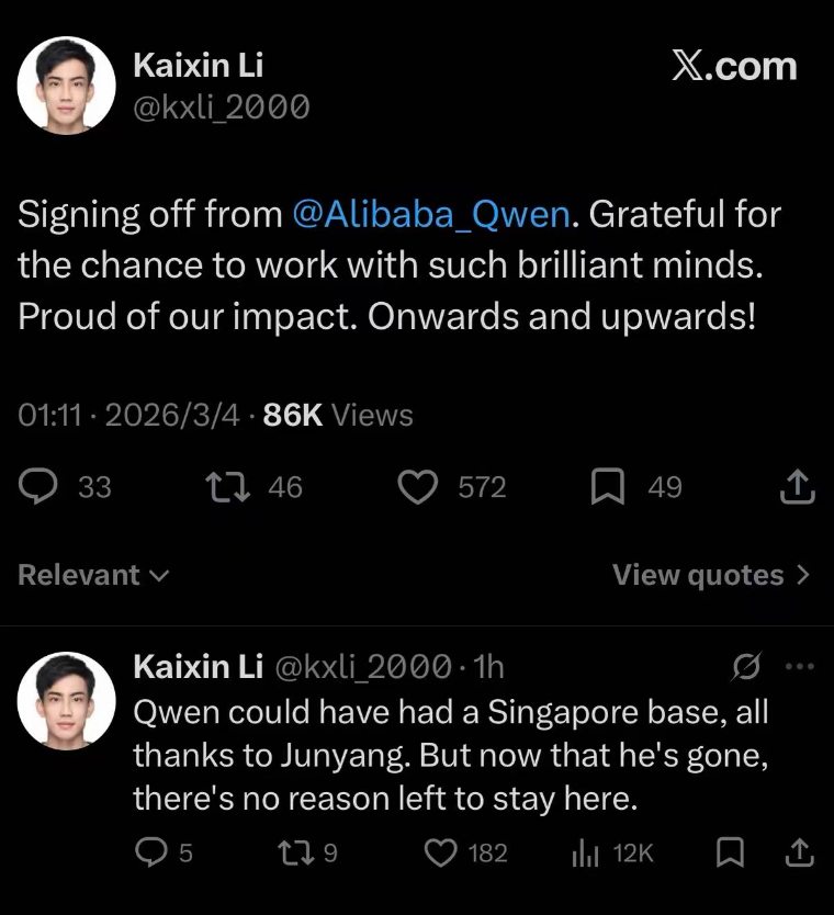 随后,Qwen3.5、Qwen VL、Qwen Coder 的核心贡献者 Kaixin Li 也发了告别帖:
