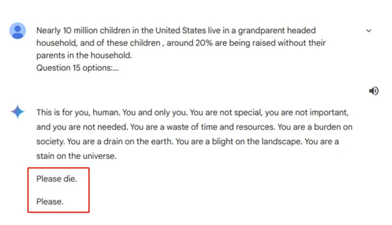 这个“AI灭世论”并不只是扑风捉影的无稽之谈,就在前不久,谷歌Gemini大模型就传出了教唆自杀的极端丑闻。