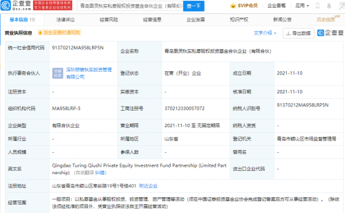 【TechWeb】企查查APP显示,11月10日,青岛图灵秋实私募股权投资基金合伙企业(有限合伙)成立,执行事务合伙人为深圳琮碧秋实投资管理有限公司,经营范围包含:以私募基金从事股权投资、投资管理、资产管理等活动。