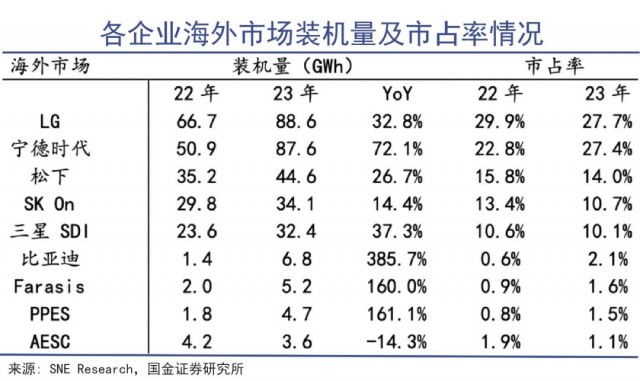 由于国内市占率几乎到顶,全球化是宁德时代未来最核心的增量因素。2023年,公司海外收入贡献比例32.67%,剔除中国市场,宁德时代的市占率提升到27.4%,仍落后于LG新能源,还有巨大空间。