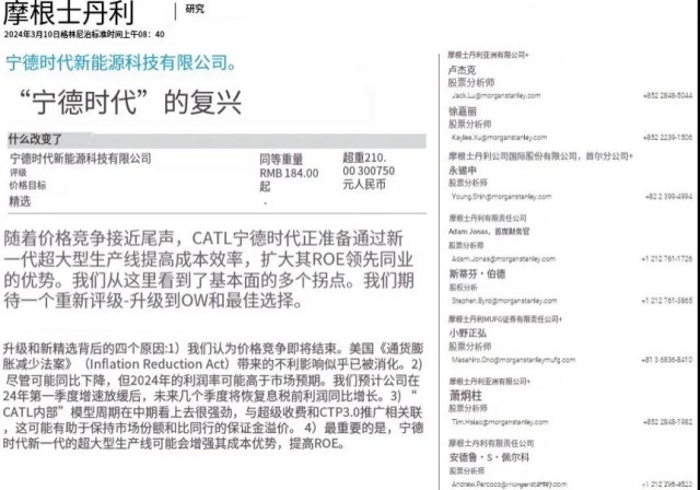 然而8个多月后,大摩又将评级调至“超配”,指出美国《通胀削减法案》的影响已基本被市场消化,公司利润率和现金流都将大幅好转。受此影响,宁王股价暴涨14.46%。