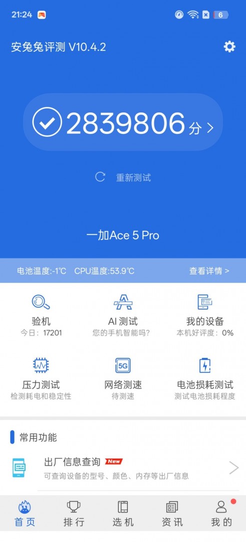 从结果来看,一加Ace 5 Pro的安兔兔跑分为2839806分,这是迄今为止跑分最高的机型,这样的表现完全可以满足多样化的应用需求。