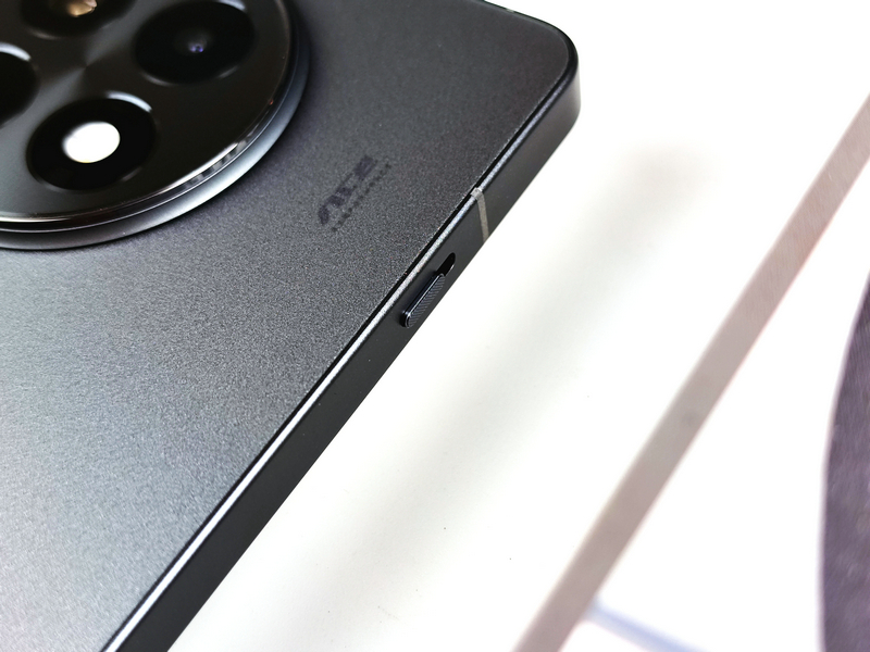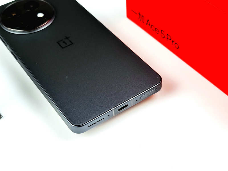 机身背部,一加Ace 5 Pro采用了全新设计语言,保持了一加一贯的简洁优雅同时,又充满性能感。配色上,该机提供有潜航黑、星穹紫和白月瓷三款配色,此次笔者拿到的是其中的潜航黑配色版本。该配色采用了新一代旗舰级金属砂丝绸玻璃工艺,还在玻璃中加入低闪砂效果,不仅在沉稳观感中带有活力,同业也带来了顺滑细腻的手感。