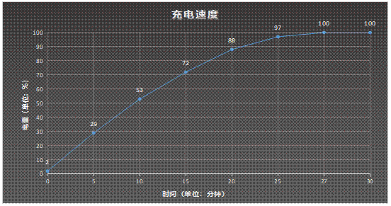 在实际充电测试中,该机5分钟便可充入29%,10分钟可充满53%,完全充满也仅需27分钟,这一充电速度与官方宣称的基本一致,可以让你在任何短暂的空余时间轻松将电池充满,解决大部分场景的充电需求,大大缓解电量焦虑。