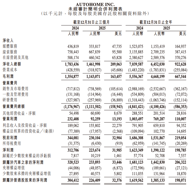 【TechWeb】3月6日消息,汽车之家(NYSE:ATHM; HKEX:2518)公布2025年第四季度及全年未经审计财报。受燃油车厂商广告支出减少及经销商数量调整影响,汽车之家全年净收入总额为64.52亿元,同比下降8.3%;归属于汽车之家的净利润为14.43亿元,同比下降14.2%;经调整净利润为16.07亿元,同比下降21.6%。