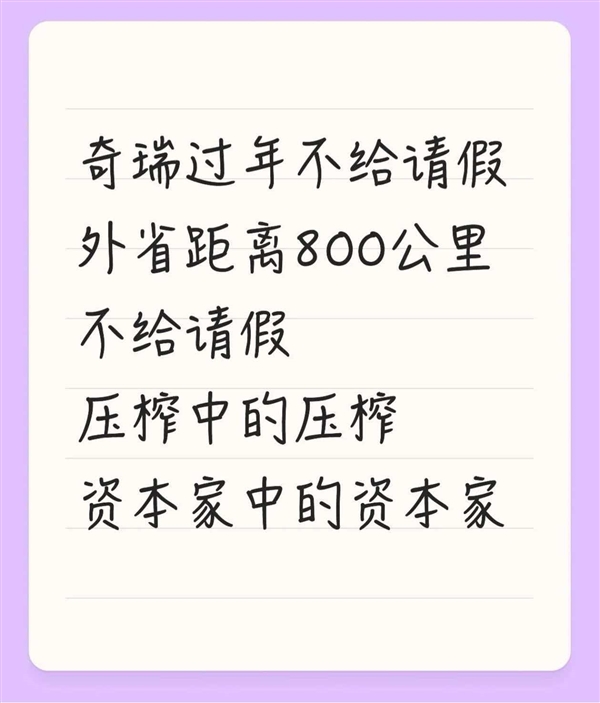春节返乡遇“拦路虎”?奇瑞汽车被曝严控请假,员工吐槽“省外仅批一天”快讯