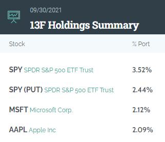 截至第三季度,高盛 $GS 的前五大持仓股分别是标普500指数ETF $SPY 、标普500指数ETF看跌期权、微软 、苹果 、罗素2000指数ETF $IWM 。
