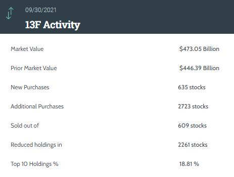 据统计,高盛三季度持仓总市值达4730.5亿美元,上一季度总市值为4463.9亿美元。该机构在三季度的持仓组合中新增了635只个股,增持了2723只个股;减持了2261只个股,清仓了609只个股。其中前十大持仓标的占总市值的18.81%。