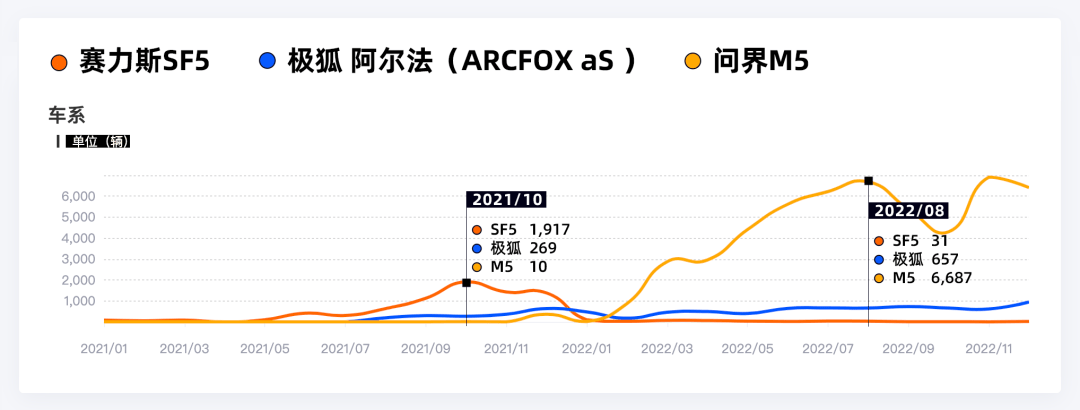要知道问界 M5 的基础车型 赛力斯 SF5 ,在变身问界以前的 2021 年,全年一共也只卖出了 6000 台。
