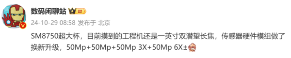 目前摸到的一款搭载SM8750(骁龙8至尊版移动平台)的超大杯旗舰的工程机还是一英寸主摄+双潜望长焦,近日有数码博主进一步带来了这款超大杯版本在影像规格上的更多细节,该机基本可以确定就是已经得到不少曝光的全新OPPO Find X8 Ultra。