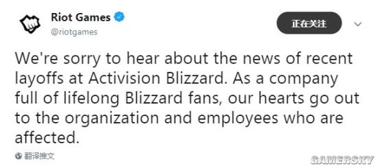 拳头游戏:我们很遗憾听到最近暴雪裁员的消息,作为一个拥有不少暴雪死忠粉丝的公司,我们对那些受到裁员影响的组织和员工深表同情。