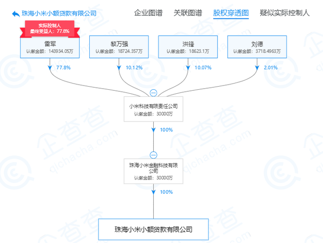 由珠海小米金融科技公司全额控股,雷军的持股比例为77.8%,持股比例为10.07%。