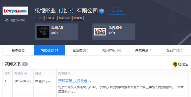 今年4月8日,乐视影业曾向法院提出申请执行,就乐视影业(北京)有限公司与乐视控股(北京)有限公司、贾跃亭质押合同纠纷一案进行执行裁定。