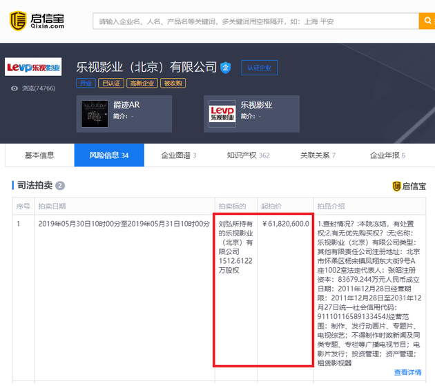 5月6日下午消息,启信宝数据显示,2019年5月30日至31日,刘弘所持有乐视影业(北京)有限公司1512.6122万股权将被拍卖,起拍价为6182万600。