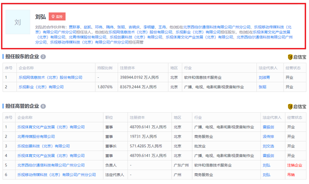 早在去年7月份,作为乐视联合创始人的刘弘辞去了乐视网副董事长的职务,不过启信宝显示,刘弘依然持有乐视多家子公司股份,他在乐视体育文化产业发展(北京)有限公司担任董事,在乐视创景科技(北京)有限公司任董事长。
