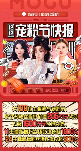 蘑菇街平台与主播狂撒红包雨,大促活动中有11位主播新增粉丝环比增长超1000%,蘑菇街平台内共计有189位主播参与本次双12。
