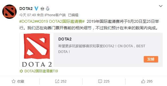 作为首届在国内举办的TI赛事,《Dota2》TI9举办时间和门票预售一直是粉丝们关注的重点。今天@Dota2官方微博正式宣布,TI9将会在8月20日-25日举行,目前他们仍然在完善门票开售前的相关细节,预计会在数周内完成。