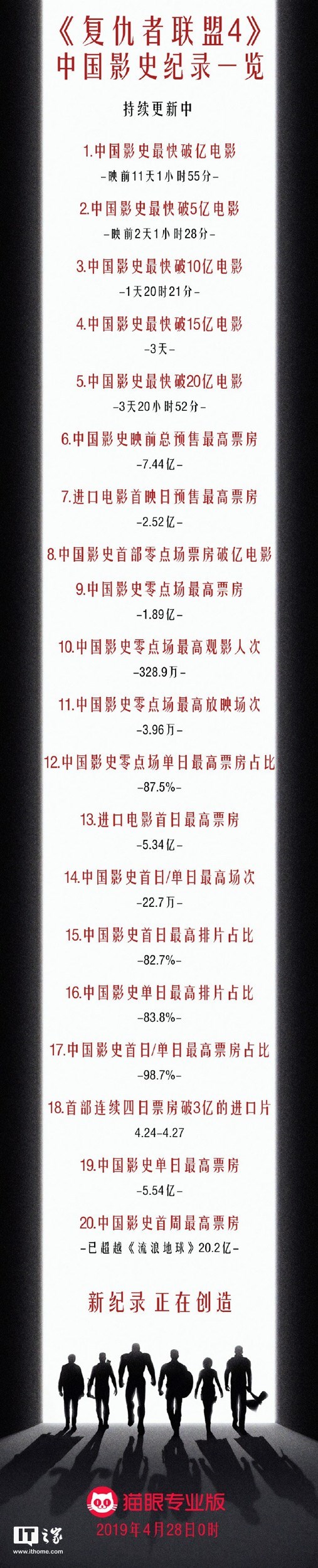 今天,猫眼电影公布《复仇者联盟4:终局之战》的部分统计数据,数据显示,《复联4》在中国内地上映四天时间里已经打破了中国电影史周最高票房、单日最高票房、单日/首日最高排片占比、单日/首日最高票房占比、单日票房纪录在内的20项影史纪录。