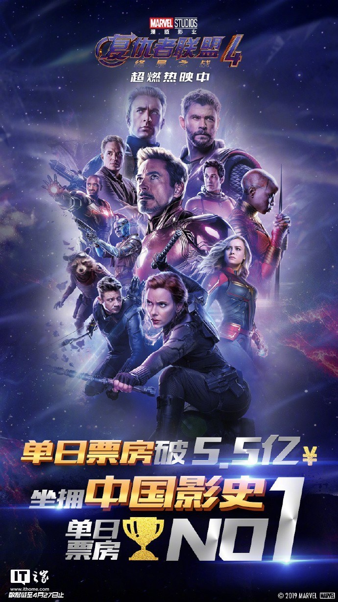 本月27日,漫威官方宣布《复仇者联盟4:终局之战》中国内地单日票房突破5.5亿元,刷新了中国电影史上最高单日票房记录。