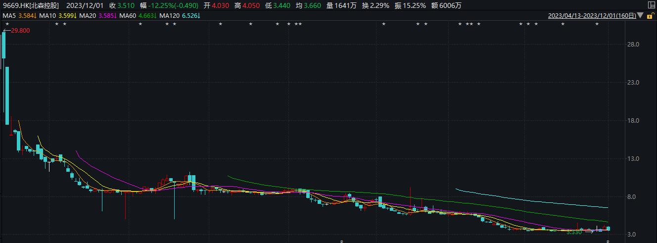 果不其然,北森控股上市首日即跌破发行价,“上市即巅峰”之后,股价一落千丈。截至今日收盘,北森控股的股价仅为3.51港元/股,市值沦落至25亿港元。相比昔日估值的两百多亿,仅剩十分之一。