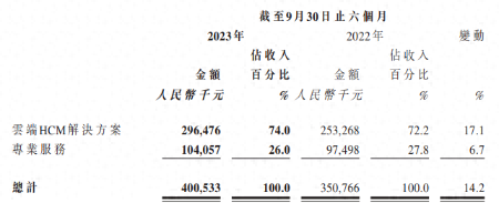 从业务方面来看,北森控股的收入主要来自于云端HCM解决方案和专业服务两类业务。其中,云端HCM解决方案是更符合SaaS特征的订阅模式,而专业服务的收费模式则涵盖了多种因素。一直以来,云端HCM解决方案为北森控股贡献了大部分收入,根据财报显示,2023年截至9月30日止六个月,云端HCM解决方案实现收入2.96亿元,占比74%,而专业服务收入占比26%。