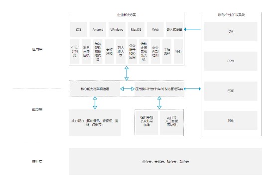 能力层需具备企业通讯需要的基本能力,包括但不限于消息/信令通道,即时通讯,实时音视频通话能力。包括客户端到大屏的能力以及视频直播点播能力,基本涵盖和支撑了企业服务的大多数场景。核心能力作为平台的业务基础,需要考察其架构设计和实现上的稳定性、可用性和可扩展能力。