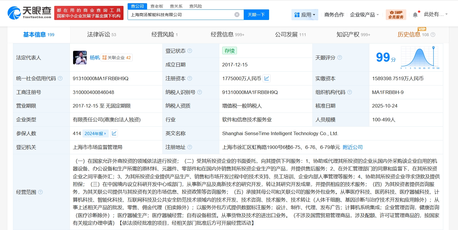 天眼查工商信息显示,近日,上海商汤智能科技有限公司发生工商变更,注册资本由162.5亿人民币增至177.5亿人民币,增幅约9%。
