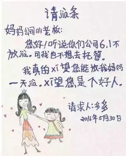 近期,网上疯传了一张孩子的请假条,一个孩子请求妈妈的老板能给妈妈在六一节放一天假,这则请假条触动了很多互联网加班狗的心弦。
