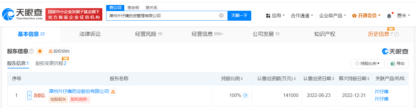 漳州片仔癀投资管理有限公司成立于2022年4月,法定代表人为黄秋敏,经营范围为以自有资金从事投资活动、自有资金投资的资产管理服务、创业投资(限投资未上市企业)等,由片仔癀(600436)全资持股。