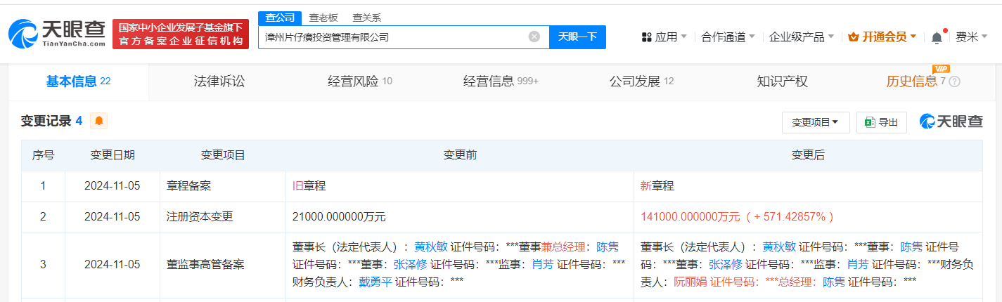 天眼查App显示,近日,漳州片仔癀投资管理有限公司发生工商变更,注册资本由2.1亿人民币增至14.1亿人民币,增幅约571%。