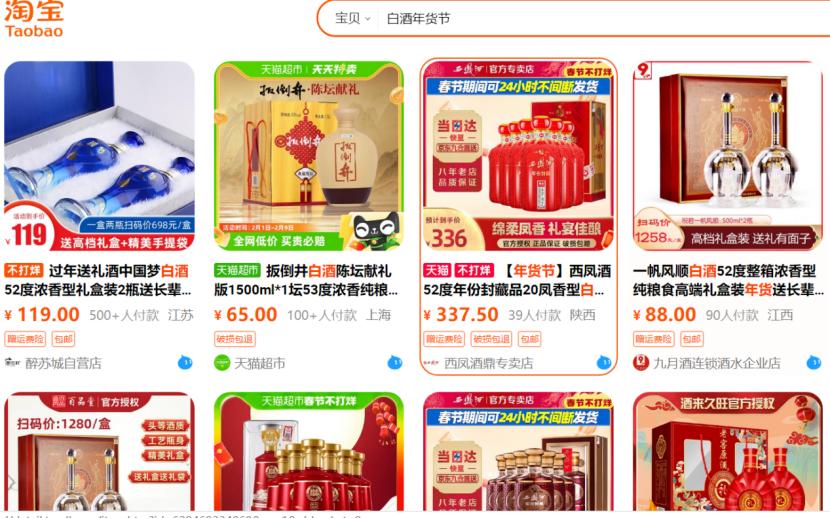 再看线上,据观察,天猫1月17日—1月29日年货节期间,茅台推出了50000瓶1499元飞天茅台,仅在开售当晚就出现了秒空的状况;而其他200-500元区间的中端酒或杂牌酒,就算推出"买一送一""大额优惠券"活动,销量依旧不高,高的也仅百人左右购买。